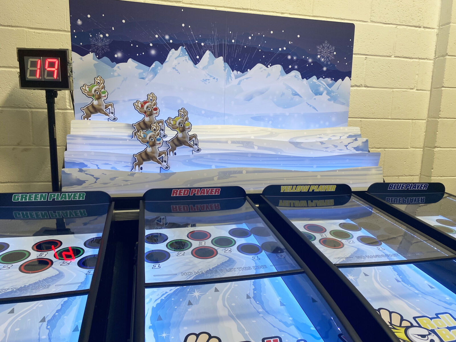 Roll and Bowl Reindeer Racing game hire is perfect for Christmas Parties and Christmas Events. Just like the traditional Kentucky Derby/Donkey Derby game but with a Christmas makeover featuring Reindeers, a winter backdrop and LED lights. Perfect for the festive season and Christmas Parties.
